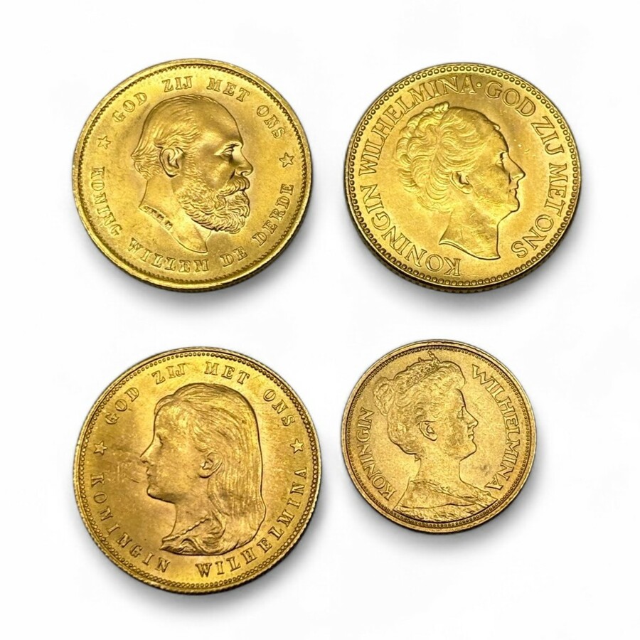 Lot van vier munten: Gouden Tientje Willem III 1889, Wilhelmina 1897 en Wilhelmina 1926. Met daarbij een Gouden Vijfje, Wilhelmina 1912