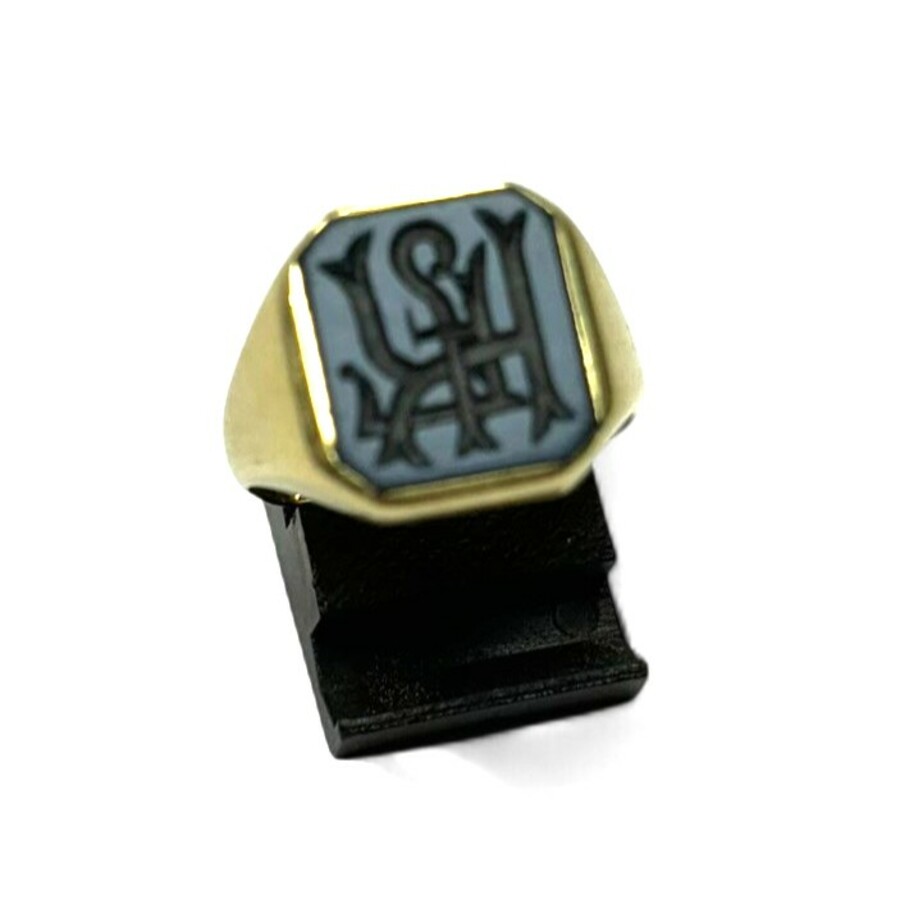 Een 14 karaats (585/1000) geelgouden heren zegelring met een lagensteen met monogram.
