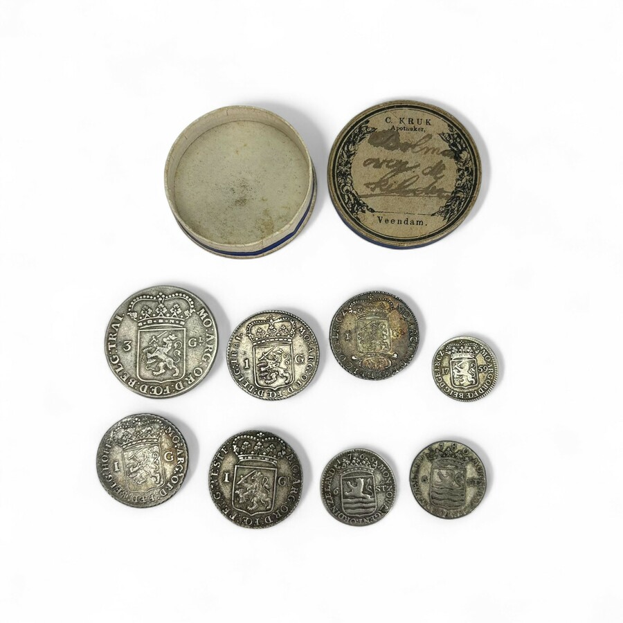 Lot diverse antieke 18e eeuwse zilveren munten, o.a. 3 Gulden munt 1795 en 1 zilveren Gulden 1794