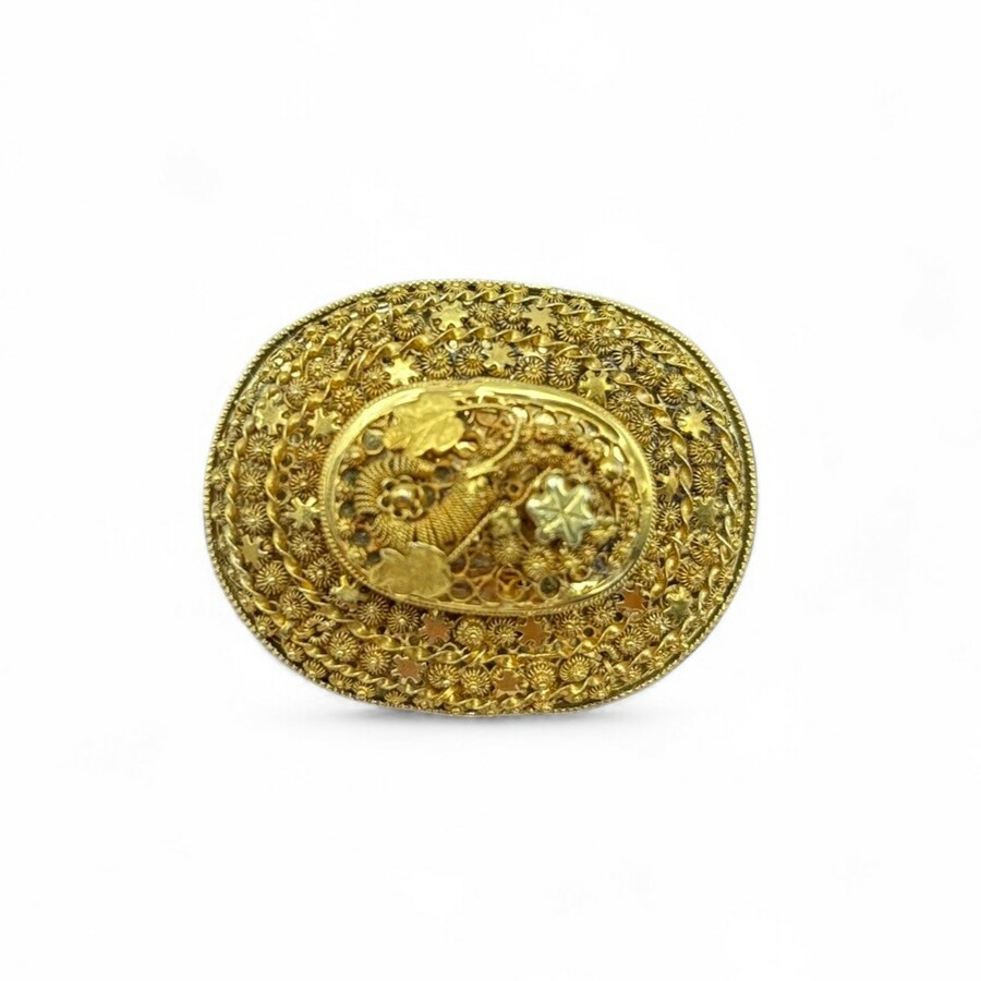 Een antieke 19e eeuwse 14 karaats (585/1000) gouden broche en hanger. Ovaal model, filigrain bewerkt, mogelijk Zeeuwse volksdracht.