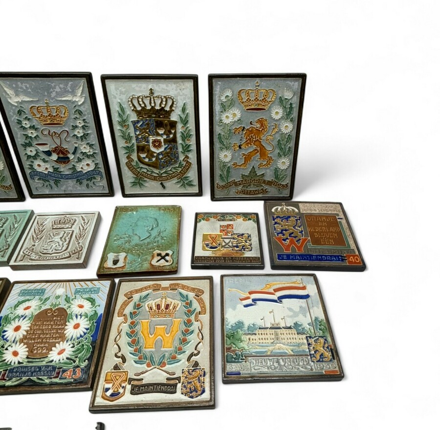 Twintig aardewerk cloisonné wandtegels, thema's: Het Koninklijk Huis en 'vaderlandsliefde', waaronder: geboortetegels prinsessen Christina en Margriet, tegel met familiewapen Nassau, en drie mon...