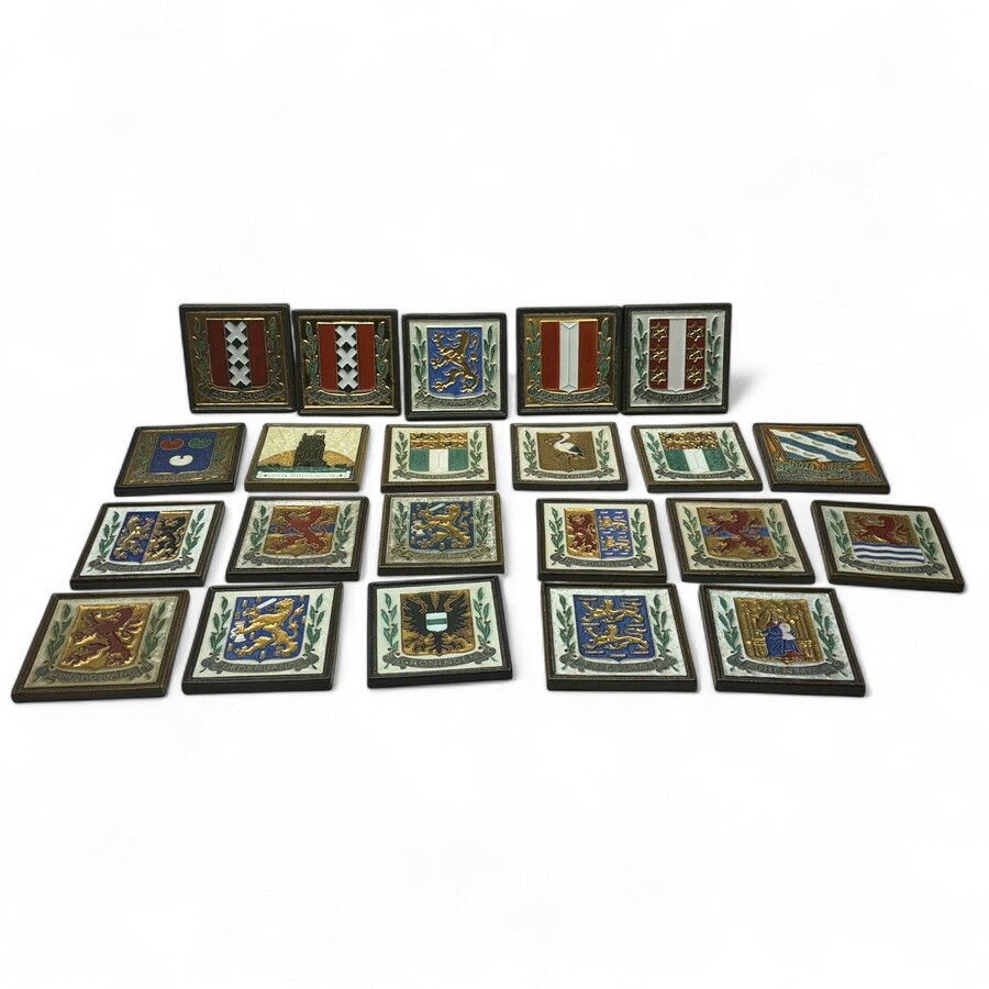 Lot van 22 aardewerk cloisonné wandtegels met polychrome decors, enkele met vergulde details, thema's: provincies en steden, waarvan tien tegels met stadswapen, waaronder: Rotterdam (2x), Amster...