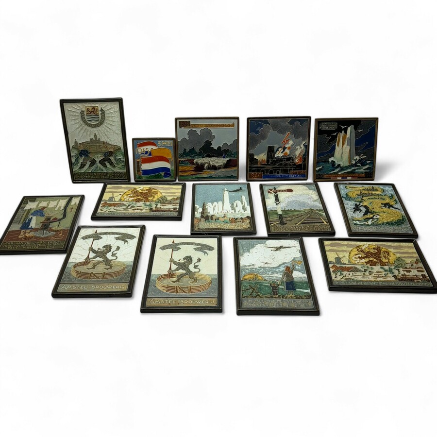 Veertien aardewerk cloisonné wandtegels met polychrome decors, thema: Tweede Wereldoorlog, waaronder: 'De wolken pakken zich samen - 1939', 'Het onweer ontlaadt zich Rotterdam - 1940', 'Standvas...