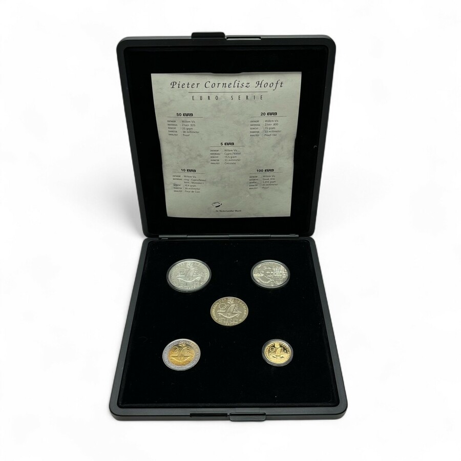 Een cassette, Pieter Cornelisz Hooft Euro Serie. Met daarin diverse munten: 5 euro (cupro-nikkel), 10 euro (cupro-nikkel), 20 euro (zilver 800), 50 euro (zilver 925) en 100 euro (Goud 916).