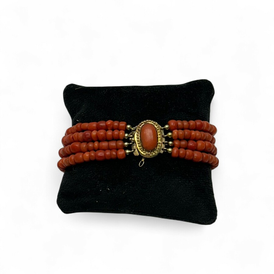 Een antieke 19e eeuwse vierrijige bloedkoralen armband met 14 karaats (585/1000) geelgouden slot, ovaal slot met filigrain bewerkte rand en centraal en cabochon geslepen bloedkoraal.