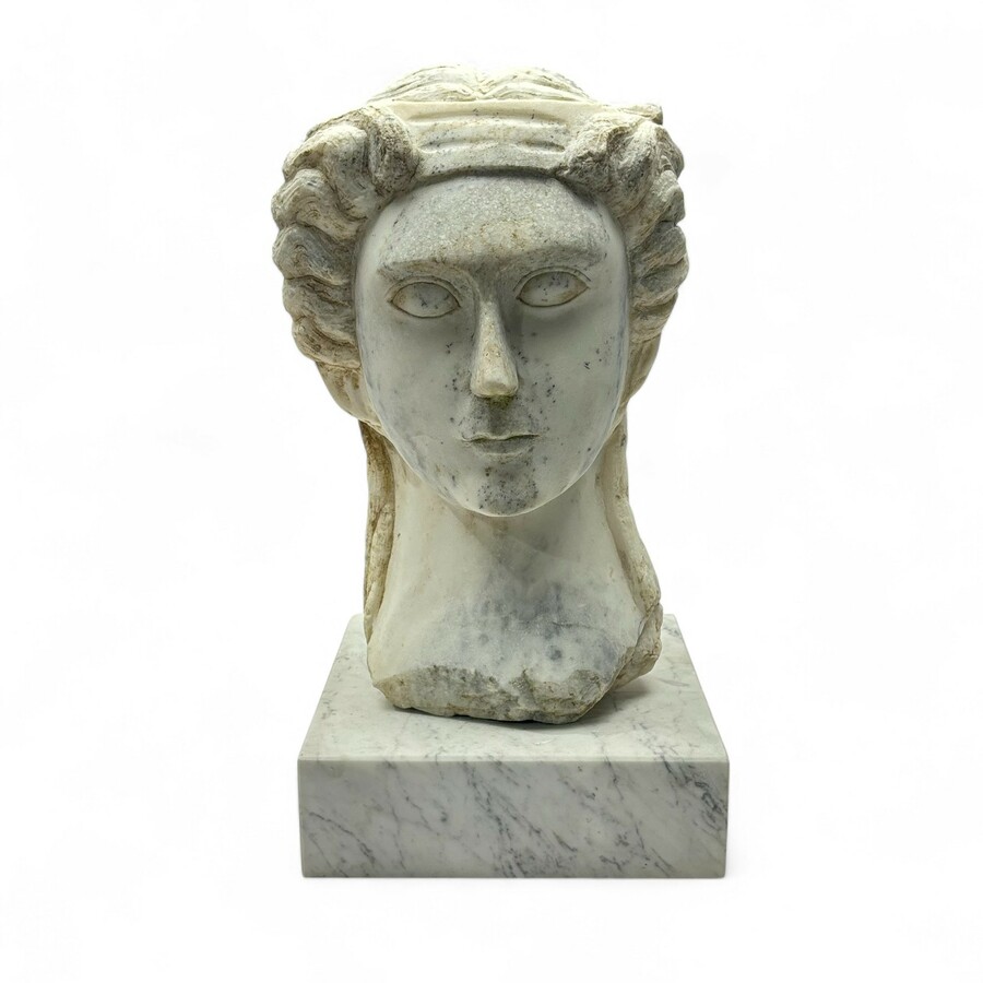Een uit marmer gebeeldhouwd buste van een vrouw naar de Griekse oudheid.