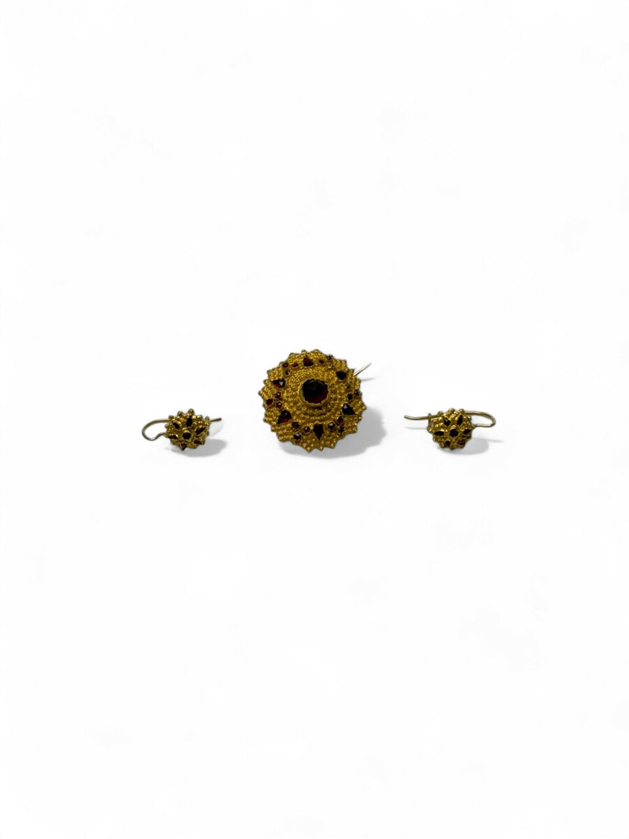 Een antieke 19e eeuwse 14 karaats (585/1000) geelgouden broche, rond model, filigrain bewerkt en bezet met ronde en druppelvormige granaat. Aan de achterzijde gemerkt met eikenblaadje. Met daarb...