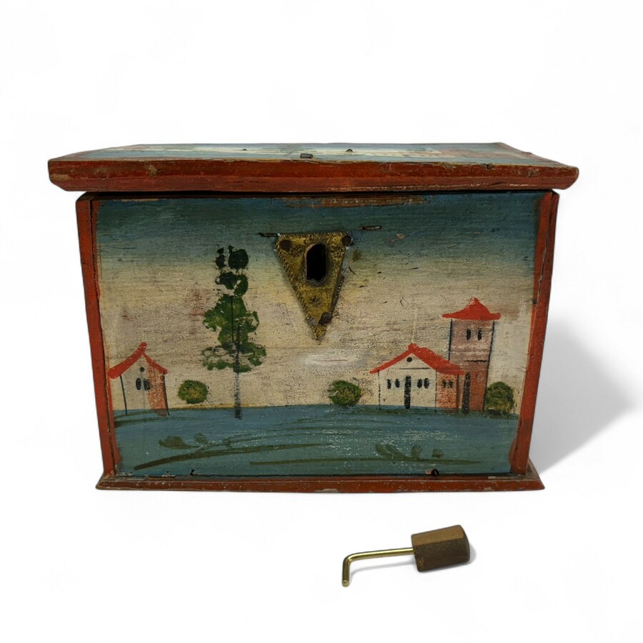 Een vroeg 19e eeuws houten sieradenkistje, mogelijk babbekistje, met decor van huisjes