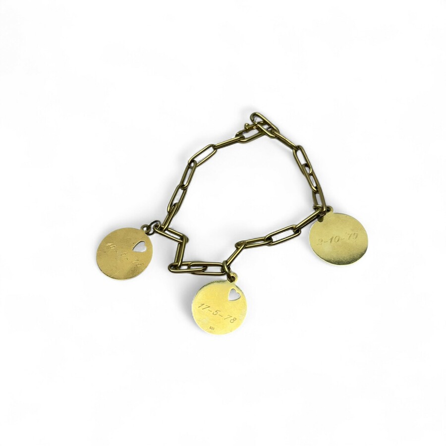 Een 20e eeuwse 14 karaats (585/1000) geelgouden closed for ever schakelarmband met drie ronde bedels.