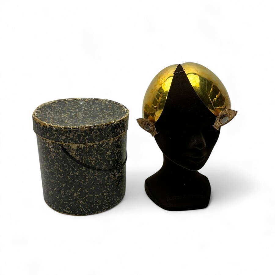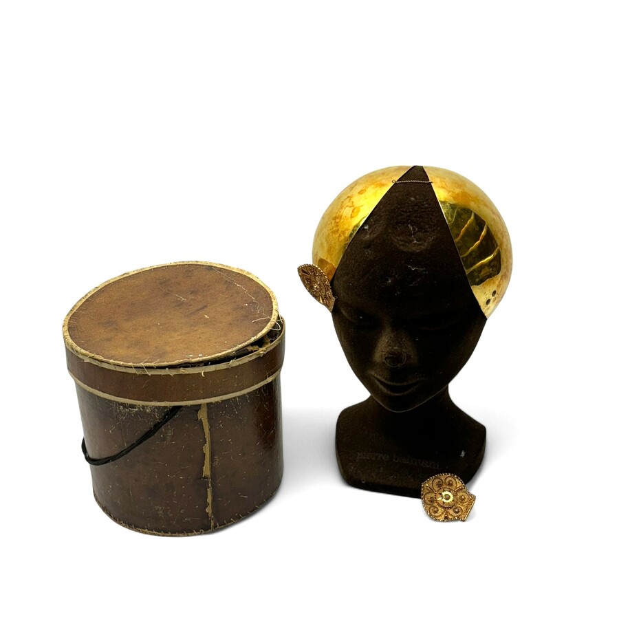 Een antiek 19e eeuws geelgouden oorijzer, ca. 1870, met twee 14 karaats (585/1000) geelgouden knoppen. Knoppen zijn filigrain versierd, met centrale rouwmedaillons van haarwerkjes, met initialen...