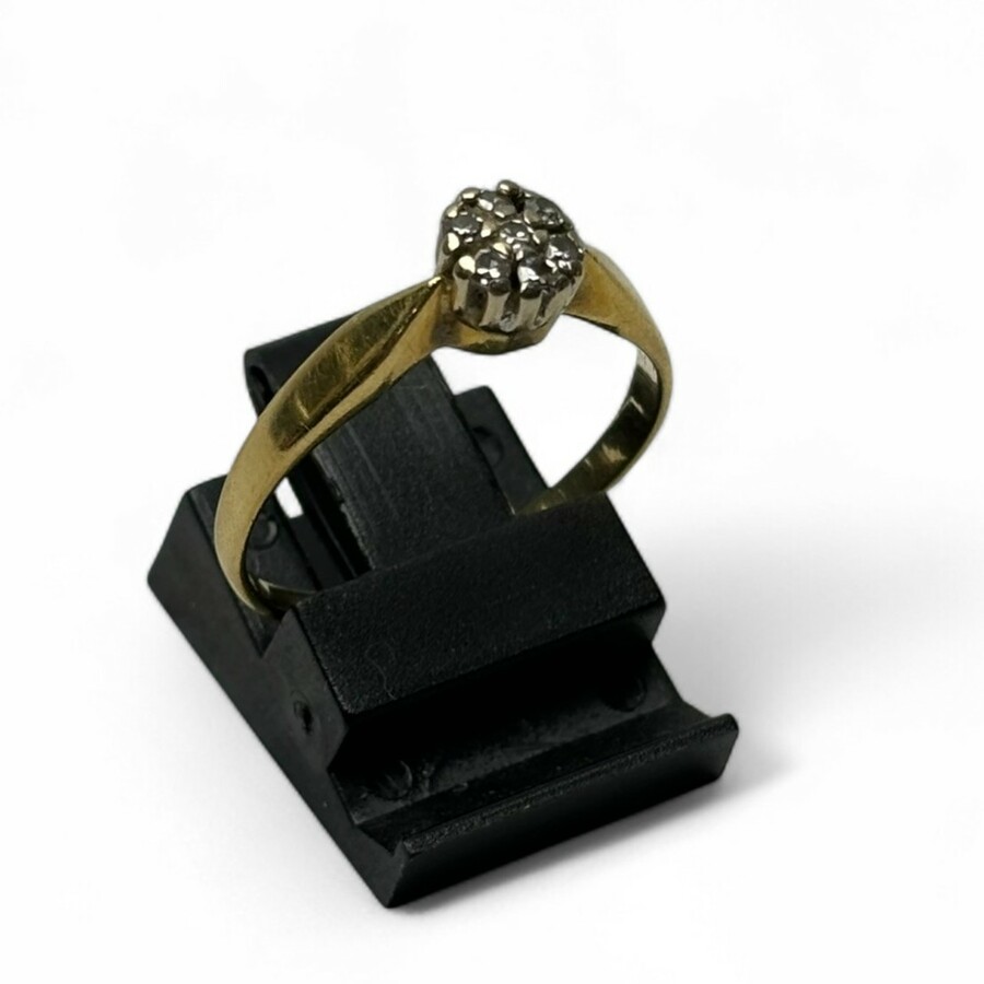 Een 20e eeuwse 18 karaats (750/1000) geelgouden entouragering, bezet met zeven briljant geslepen diamanten. Gemerkt ‘750’ en ‘LPC’ aan de binnenzijde van de ring