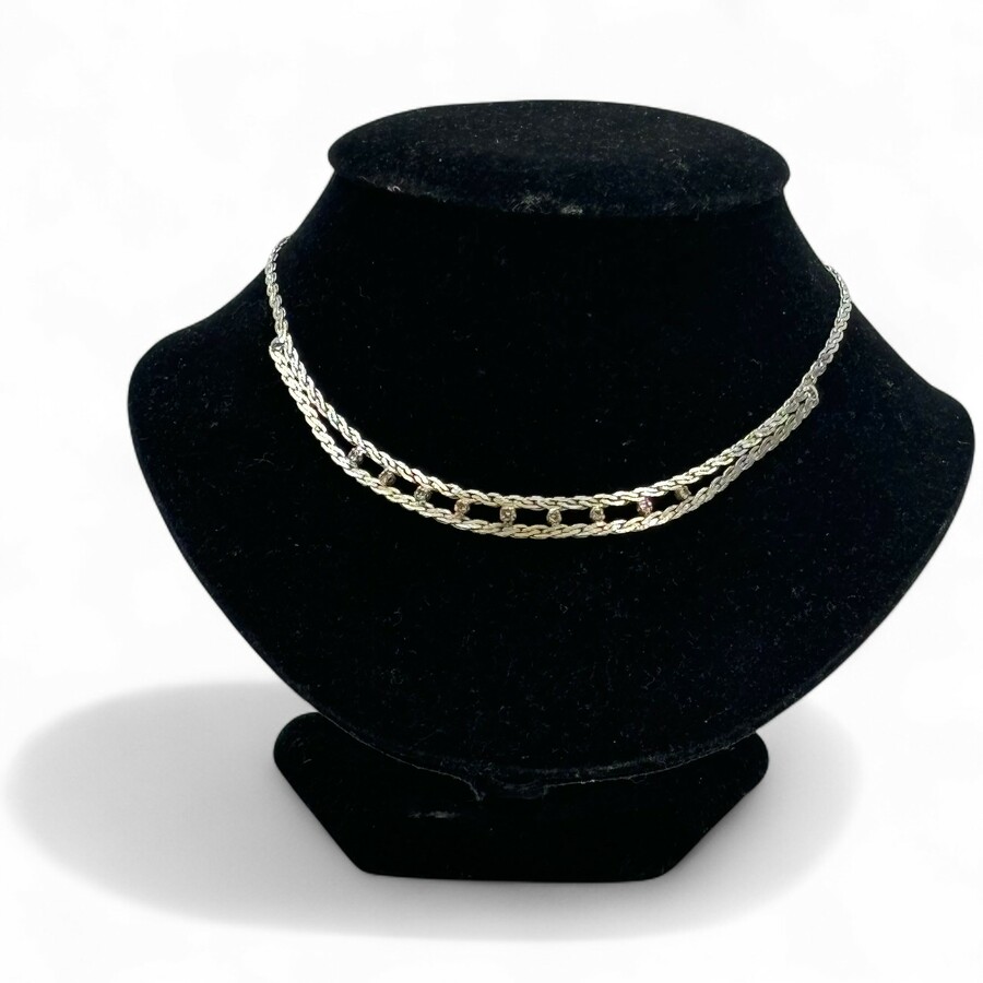 Een 20e eeuws 14 karaats (585/1000) witgouden collier, gevlochten model, bezet met negen briljant geslepen diamantjes. Gemerkt ‘585’ op de sluiting.