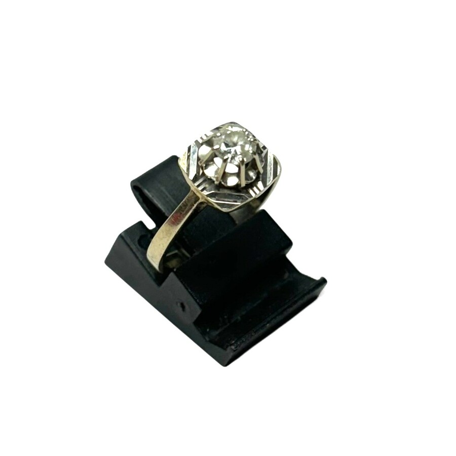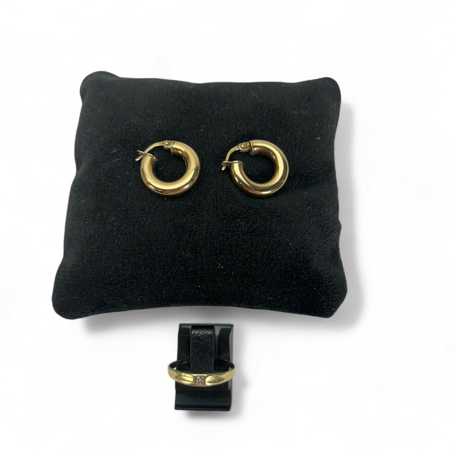 Een stel 20e eeuwse 14 karaats (585/1000) geelgouden oorknoppen, rond model. Met daarbij een dunne 14 karaats (585/1000) geelgouden ring met klein steentje. Samen 2,34 gram
