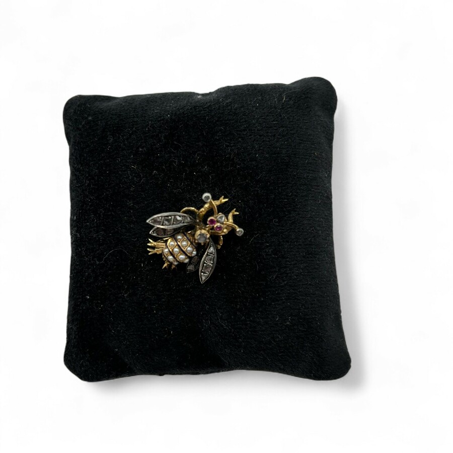 Een antieke 14 karaats (585/1000) geelgouden broche in de vorm van een insect, geëmailleerd en bezet met elf zaadparels, zestien roosgeslepen diamanten en twee robijntjes. Gemerkt op de sluiting...