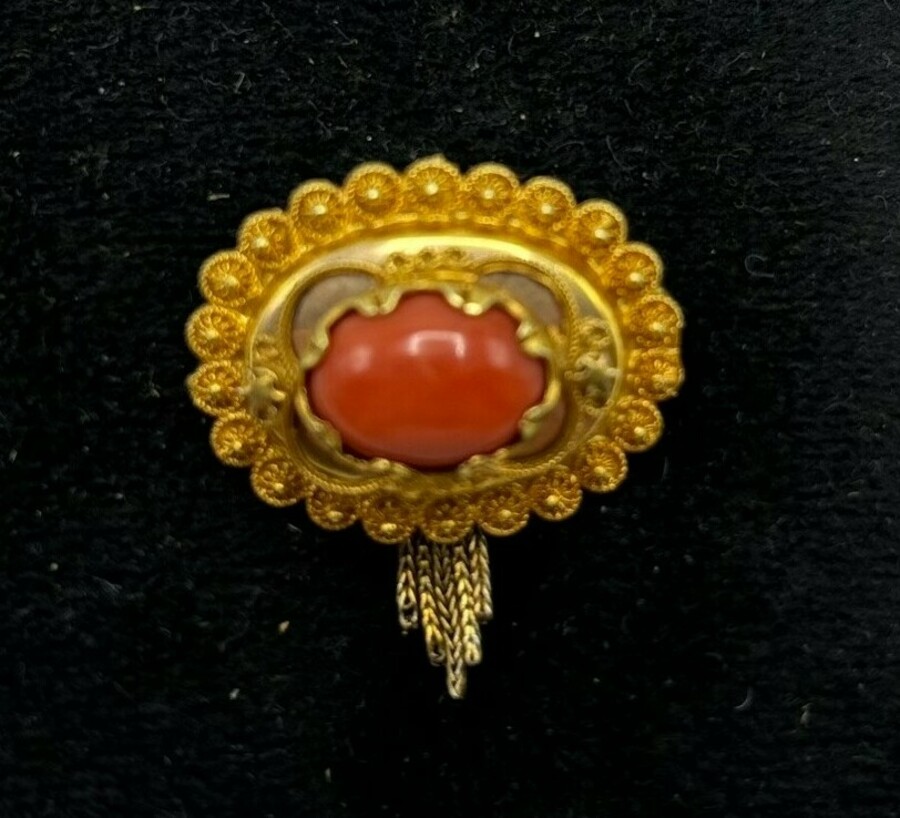 Een antieke 14 karaats (585/1000) geelgouden broche. ovaal model, filigrain bewerkte rand, met centraal een cabuchon geslepen bloedkoraal. Met aan de onderzijde een kwastje. Aan de achterzijde g...