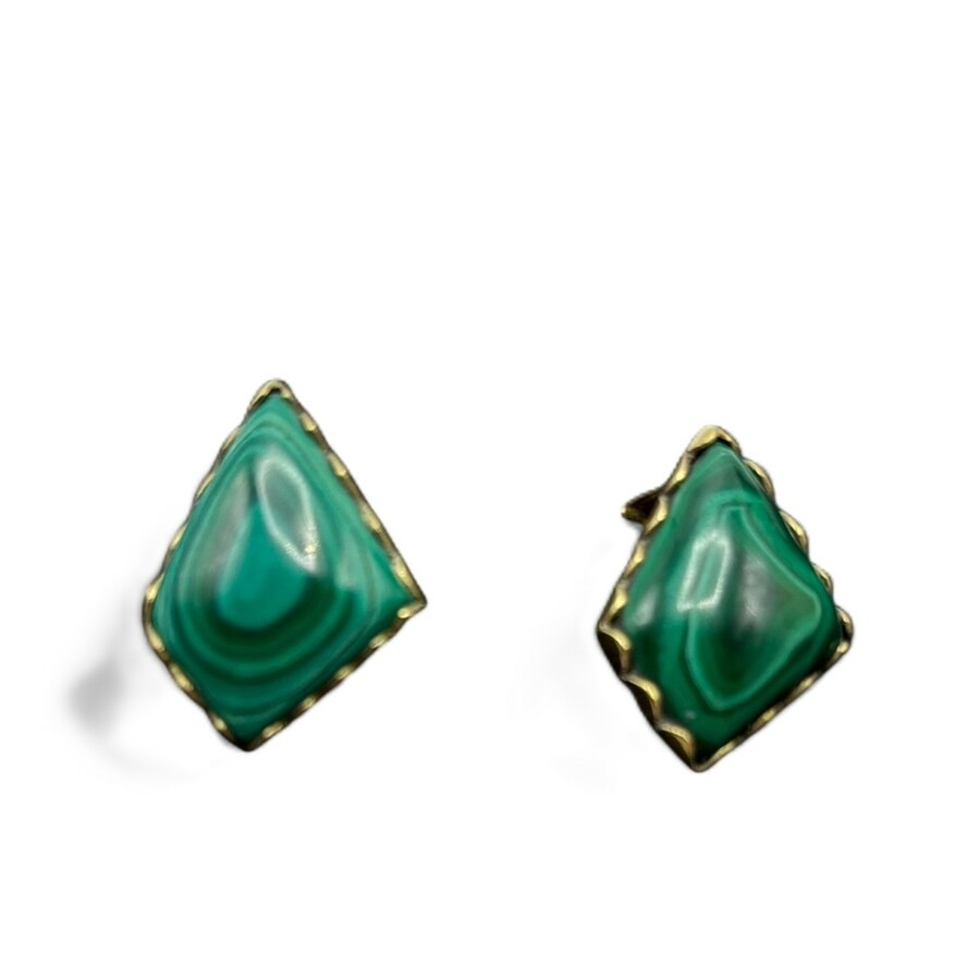 Een stel 20e eeuwse 18 karaats (750/1000) geelgouden oorclips, bezet met assymetrische ruitvormige malachiet.
