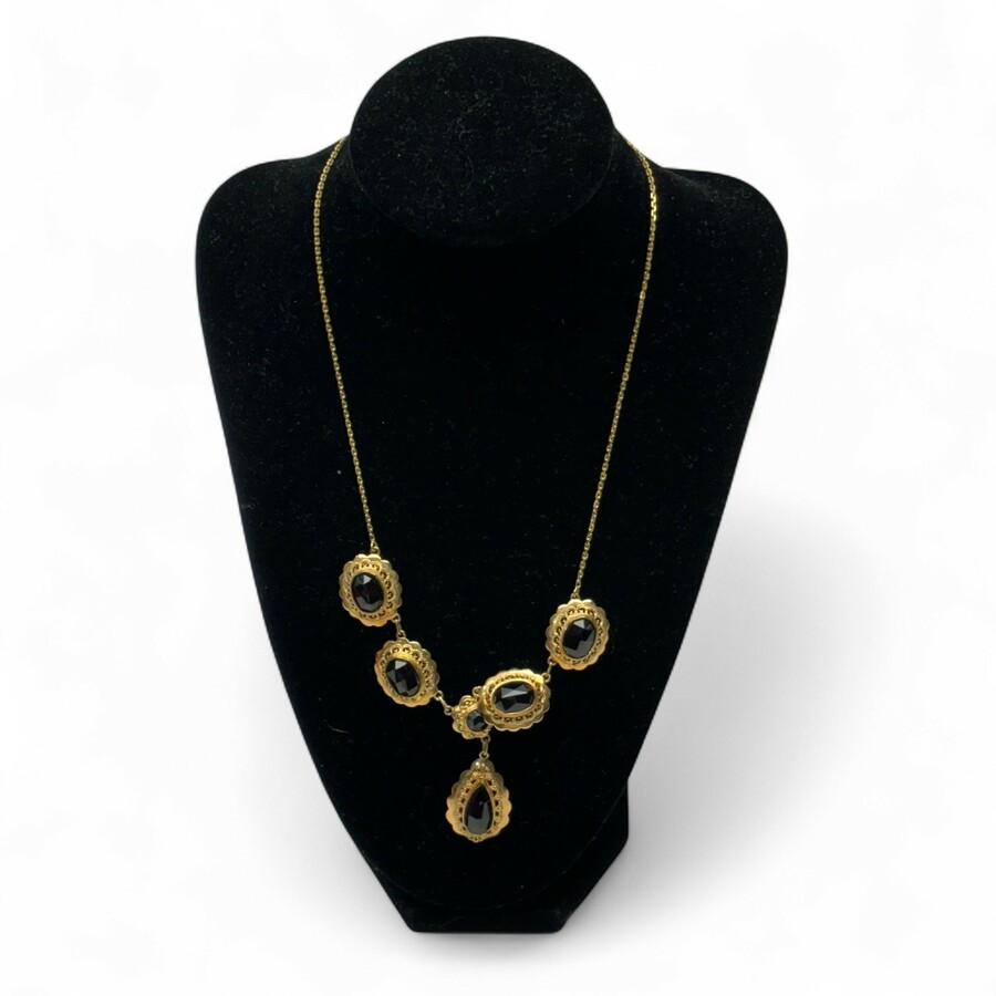 Een 20e eeuws 14 karaats (585/1000) geelgouden collier, met ovale, opengewerkte en gecontourneerde schakels, en één druppelvormige hanger. Allen bezet met gefacetterde granaat. Gemerkt op de slu...