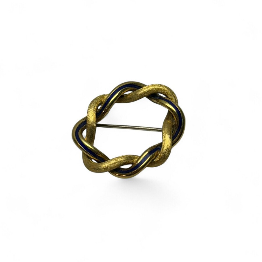 Ovale 14 karaats gouden broche, opgebouwd uit twee om elkaar draaiende slingers, gedeeltelijk gedecoreerd met donkerblauw email, gemerkt