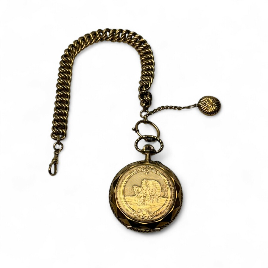 Een antieke laat 19e eeuws 14 karaats (585/1000) geelgouden zakhorloge, gegraveerd met voorstelling van een boerenkar met twee paarden en een landschap. Aan een 14 karaats (585/1000) gouden chat...