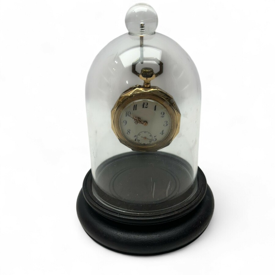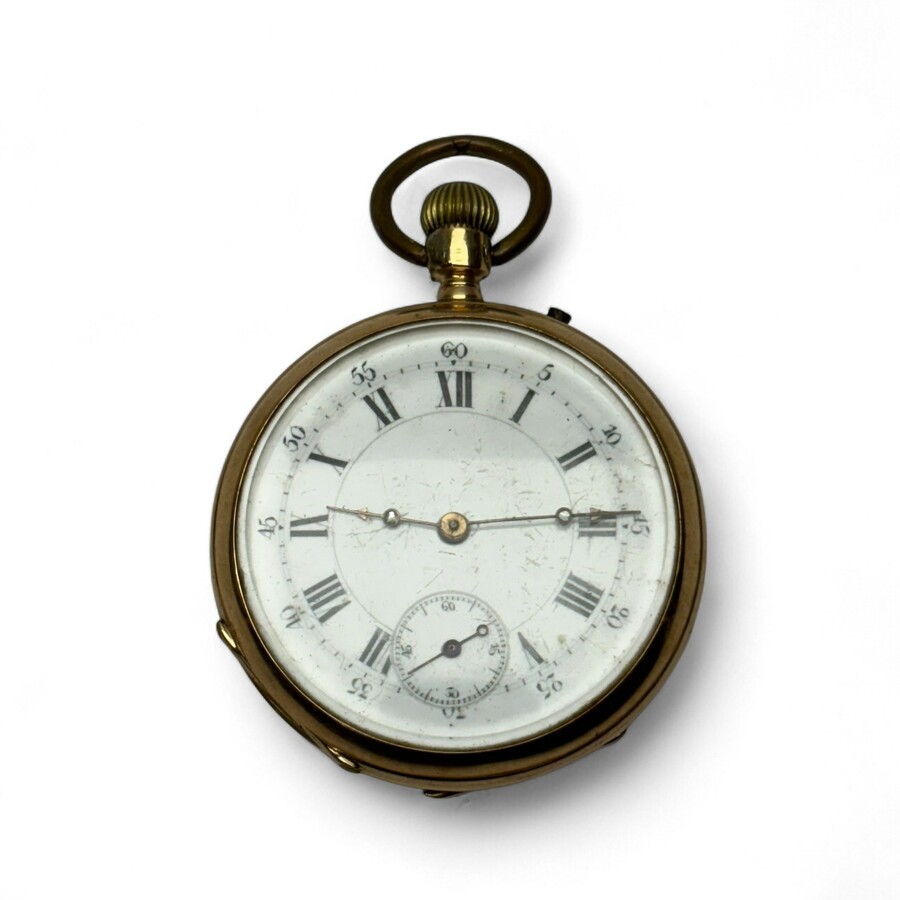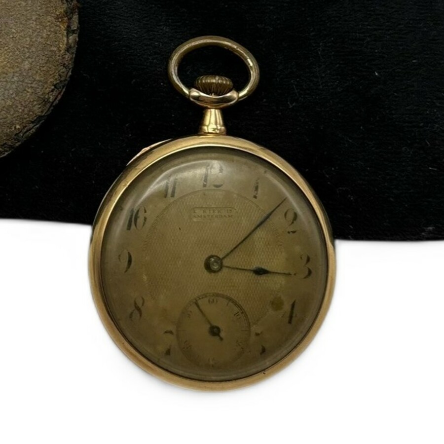 Een vroeg 20e eeuws 14 karaats (585/1000) geelgouden zakhorloge, guilloche gegraveerde achterzijde met schildje, wijzerplaat met Romeinse cijfers en secondeaanduiding, gemerkt E. Kiek Amsterdam....