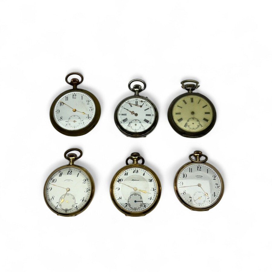 Lot met zes vroeg 20e eeuwse heren zakhorloges. Voorzien van witte emaille wijzerplaten. Diverse merken.
