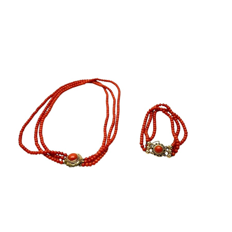 Een 20e eeuws drierijig bloedkoralen armband en collier, beide met 14 karaats (585/1000) geelgouden slot.