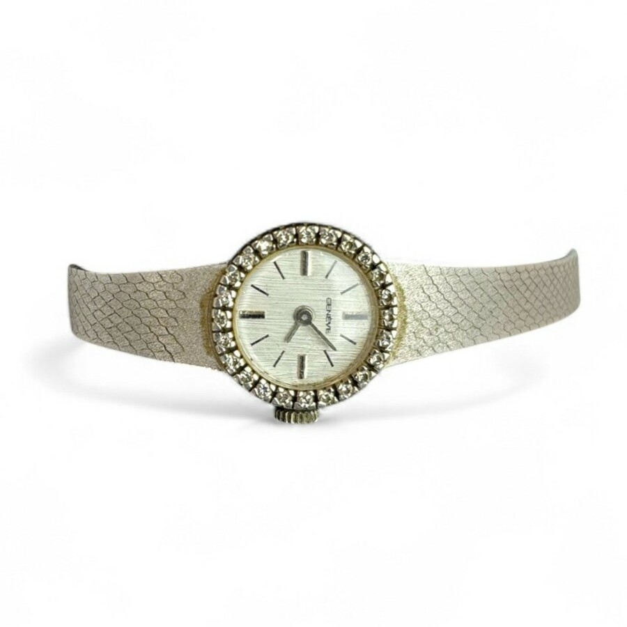 Een 20e eeuws 14 karaats (585/1000) witguden dameshorloge, Geneve. Ronde kast, rand bezet met briljant geslepen diamant, op gladde witgouden band