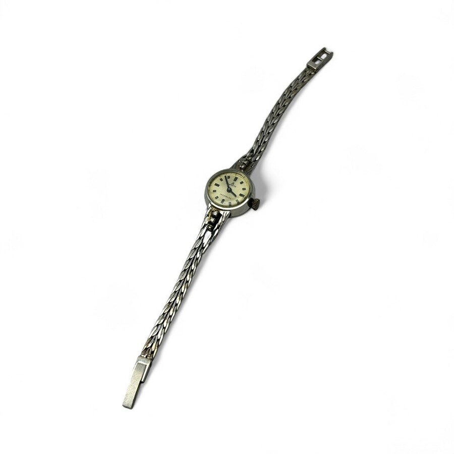 Een 20e eeuws 14 karaats (585/1000) witgouden dameshorloge, Marti, op witgouden band, bezet met zes briljant geslepen diamantjes