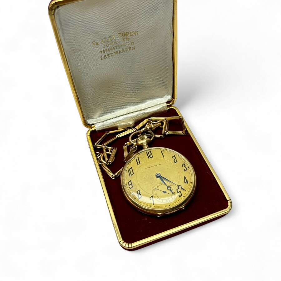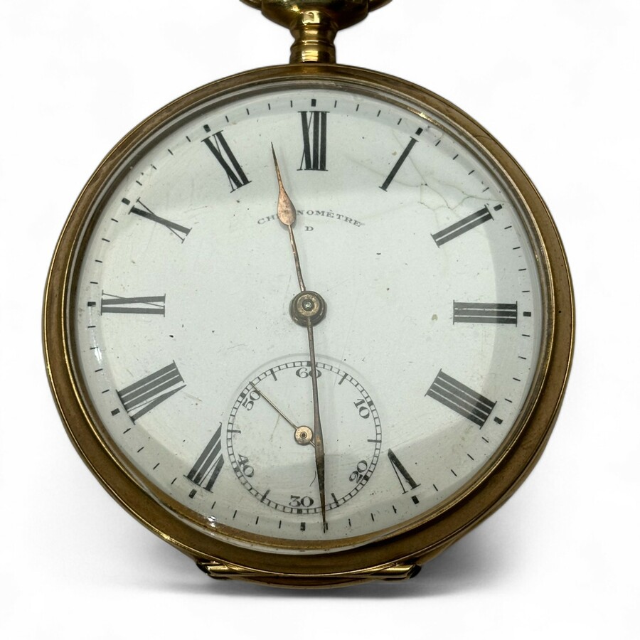 Een antiek 14 karaats (585/1000) geelgouden herenzakhorloge. Goudkleurige wijzerplaat met romeinse cijferaanduiding, secondewijzer, met opschrift 'Chronometre'. Achterzijde kast guilloche bewerk...