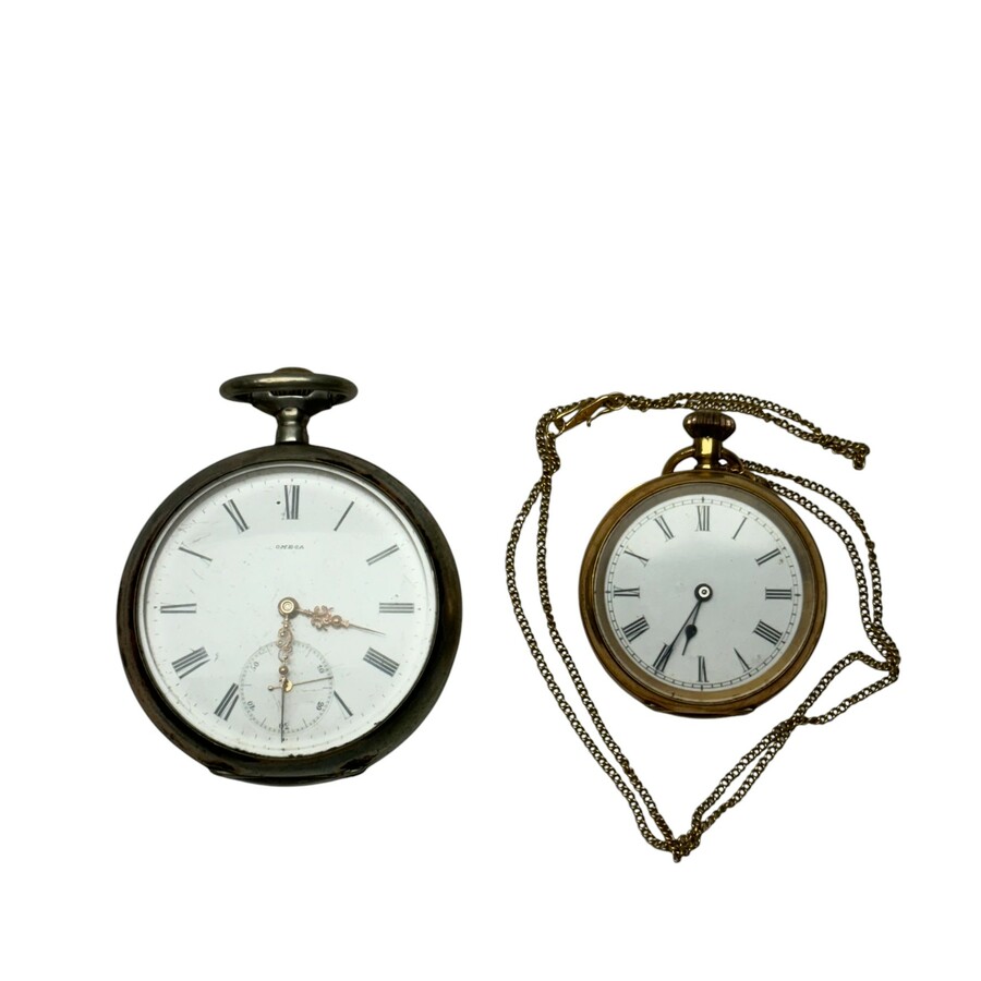 Lot van twee zakhorloges: een vroeg 20e eeuws derde gehalte (800/1000) zilveren Omega zakhorloge. Met daarbij een antiek 18 karaats (750/1000) geelgouden dameszakhorloge aan 14 karaats (585/1000...