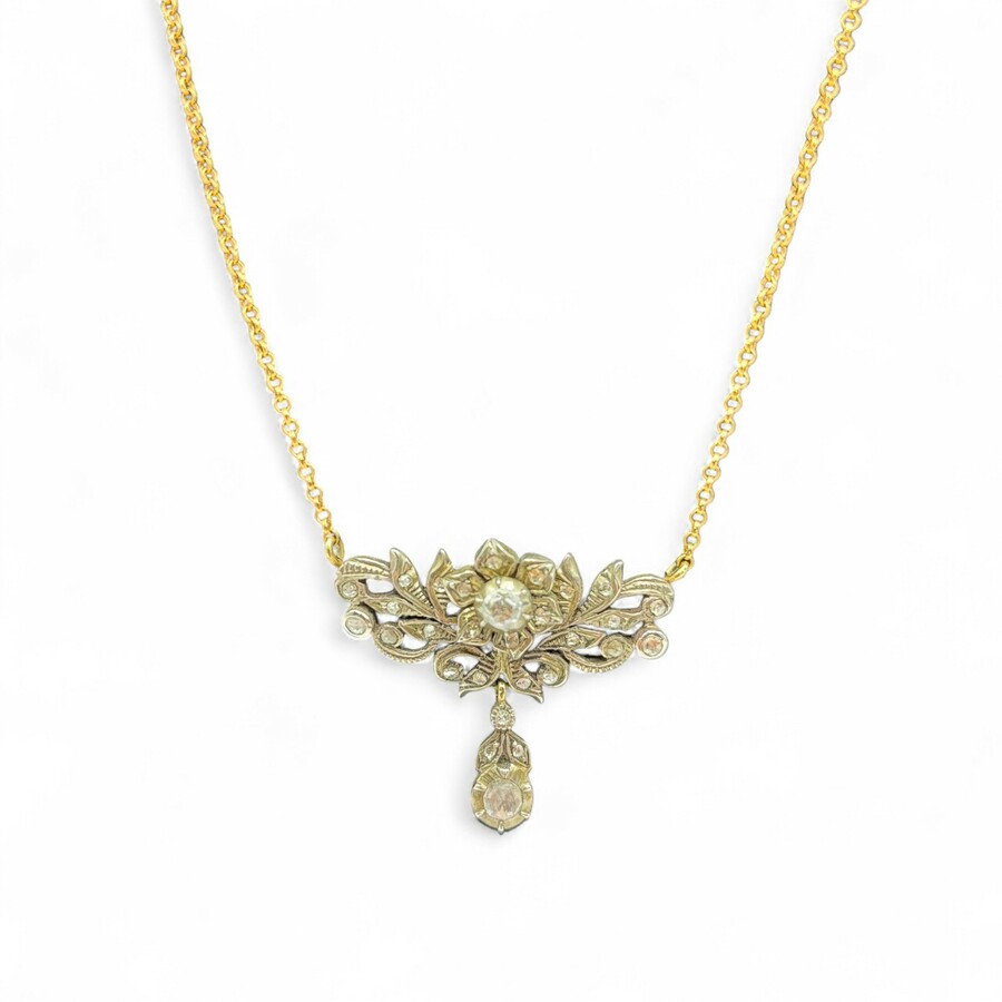 Een 20e eeuws 14 karaats (585/1000) geelgouden collier, met daaraan een tweede gehalte (835/1000) zilveren hanger, bezet met ca. 30 roosgeslepen diamantjes