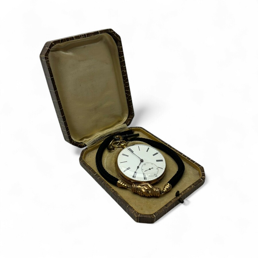 Een antiek 14 karaats (585/1000) geelgouden zakhorloge, Zwitsers, ca. 1900. Emaille wijzerplaat met Romeinse cijferaanduiding en secondeaanduiding, gemerkt 'Chronometre'op de wijzerplaat. Met ha...