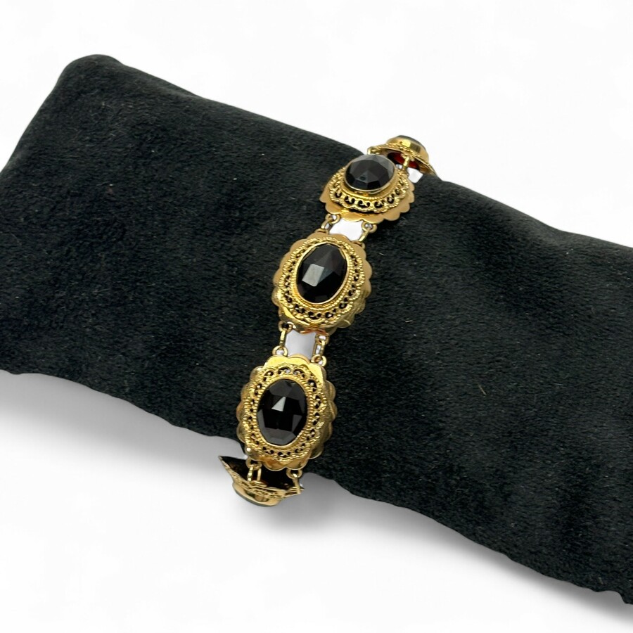 Een 20e eeuwse 14 karaats (585/1000) geelgouden armband, met opengewerkte, gecontourneerde schakels, allen bezet met acht gefacetteerde granaten. Gemerkt op de sluiting.