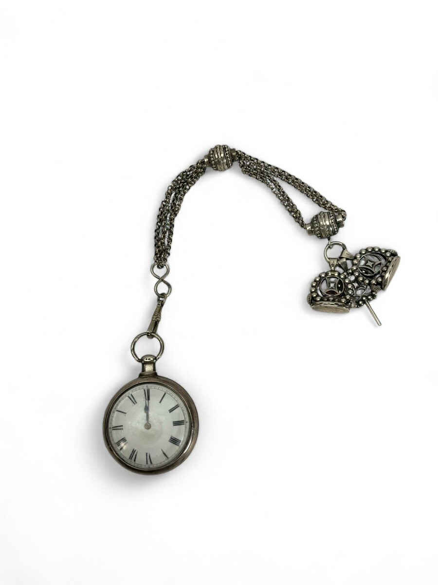 Een antiek zilveren herenzakhorloge in dubbele zilveren kast, aan chatelaine, met drie signetten.