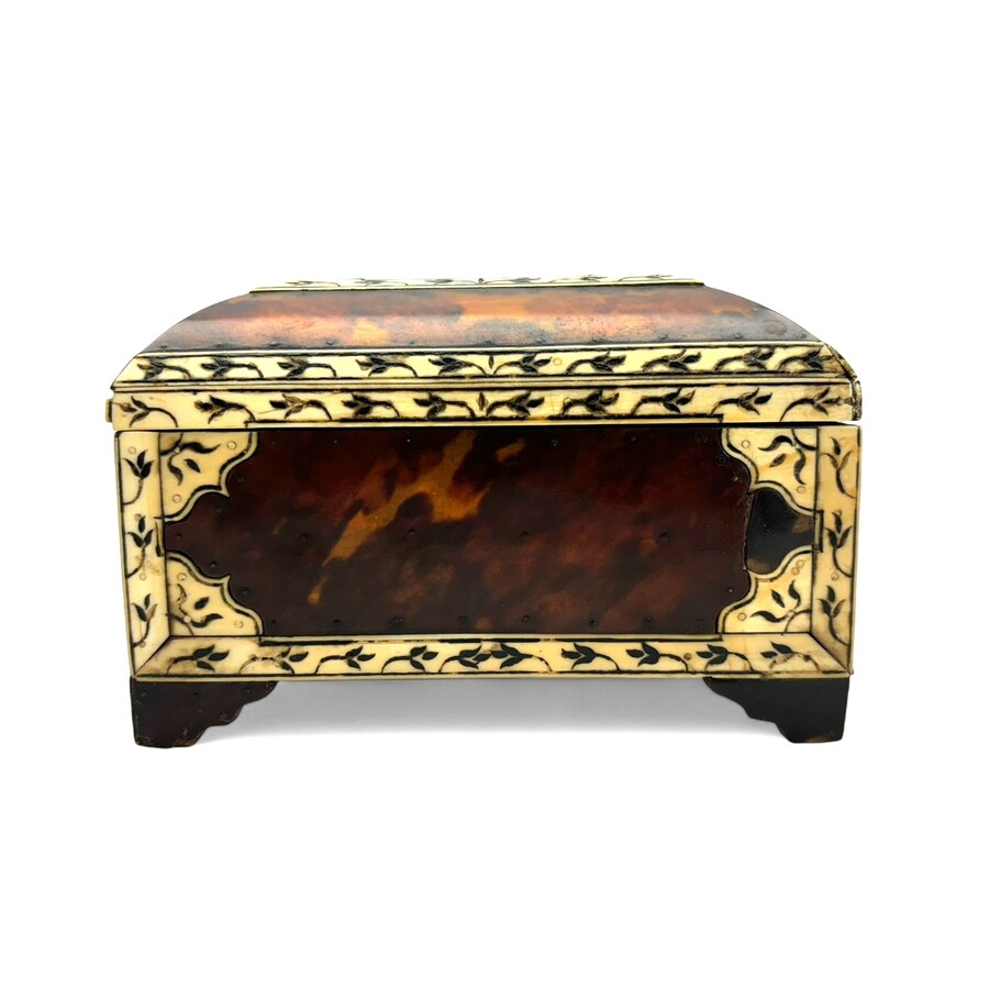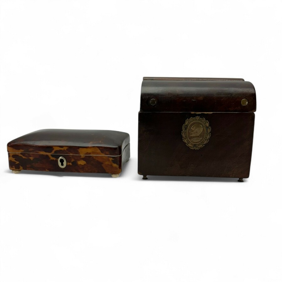 Een antieke 19e eeuwse mahoniehouten theekist, met koperen plaquette van paus (?). Met daarbij een 19e eeuwse schildpad lepeldoos, gevuld met o.a. zilveren knopen.