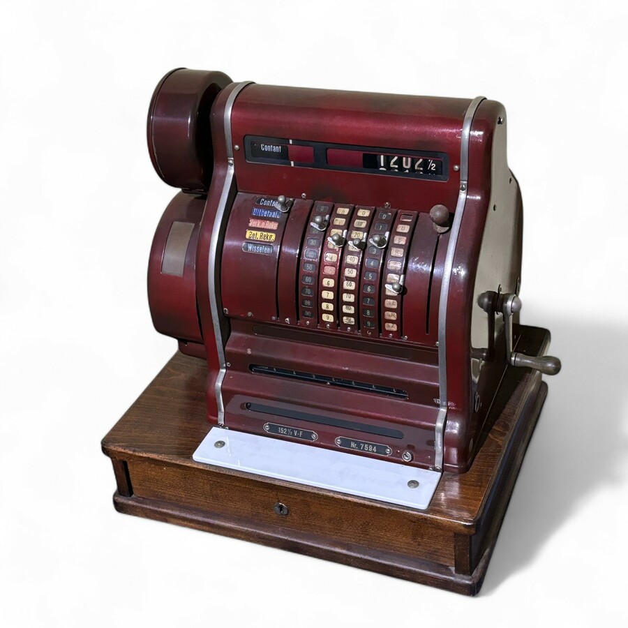 Een antieke kassa, gemerkt 'Nationaal Kasregisters'.