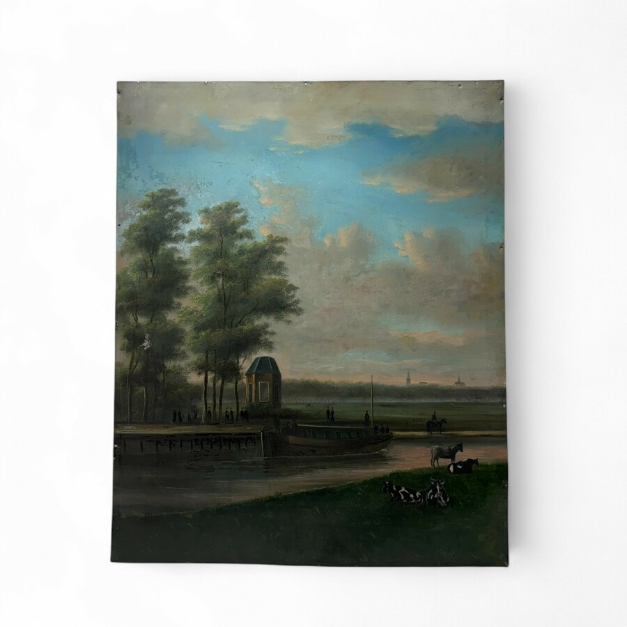 Een antiek 19e eeuws metalen schoorsteenstuk, voorstelling van een trekschuit in een vaart, met theekoepel en stad op de achtergrond. Ongesigneerd