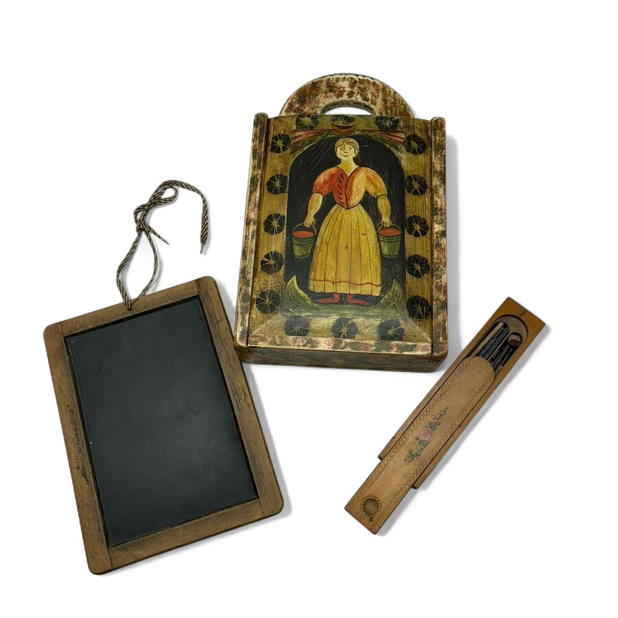 Een antieke 19e eeuwse volkskunst beschilderde Jouster schooltas, met aan de voorzijde afbeelding van boerin met twee emmers