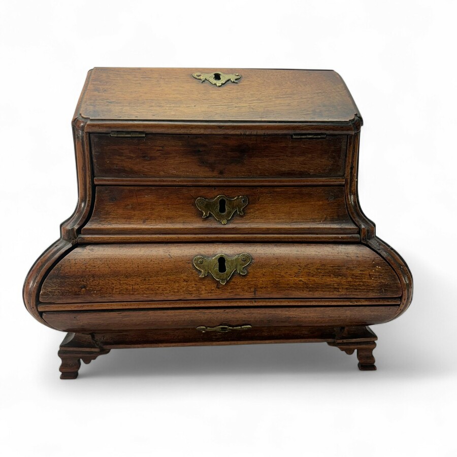 Een antieke 18e of 19e eeuwse houten miniatuur secretaire, gebogen, met drie lades