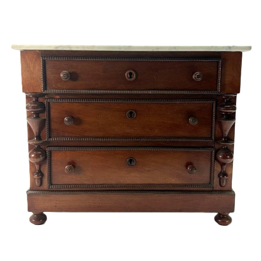 Een antieke 19e eeuwse mahoniehouten gefineerde commode met drie lades en marmeren blad. Mogelijk een meesterstukje.