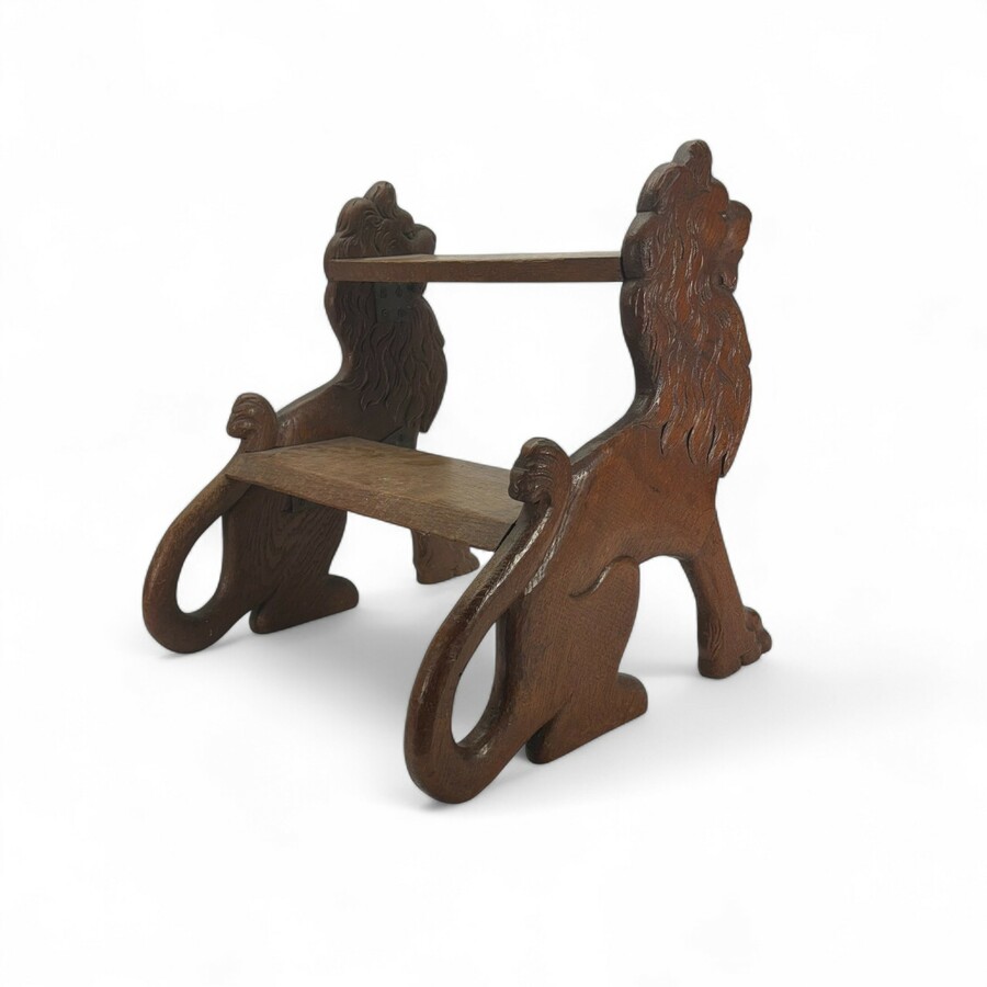 Een antiek 19e eeuws uit eikenhouten gestoken trappetje voor bedstee, met aan weerszijden twee gestoken, zittende leeuwen.