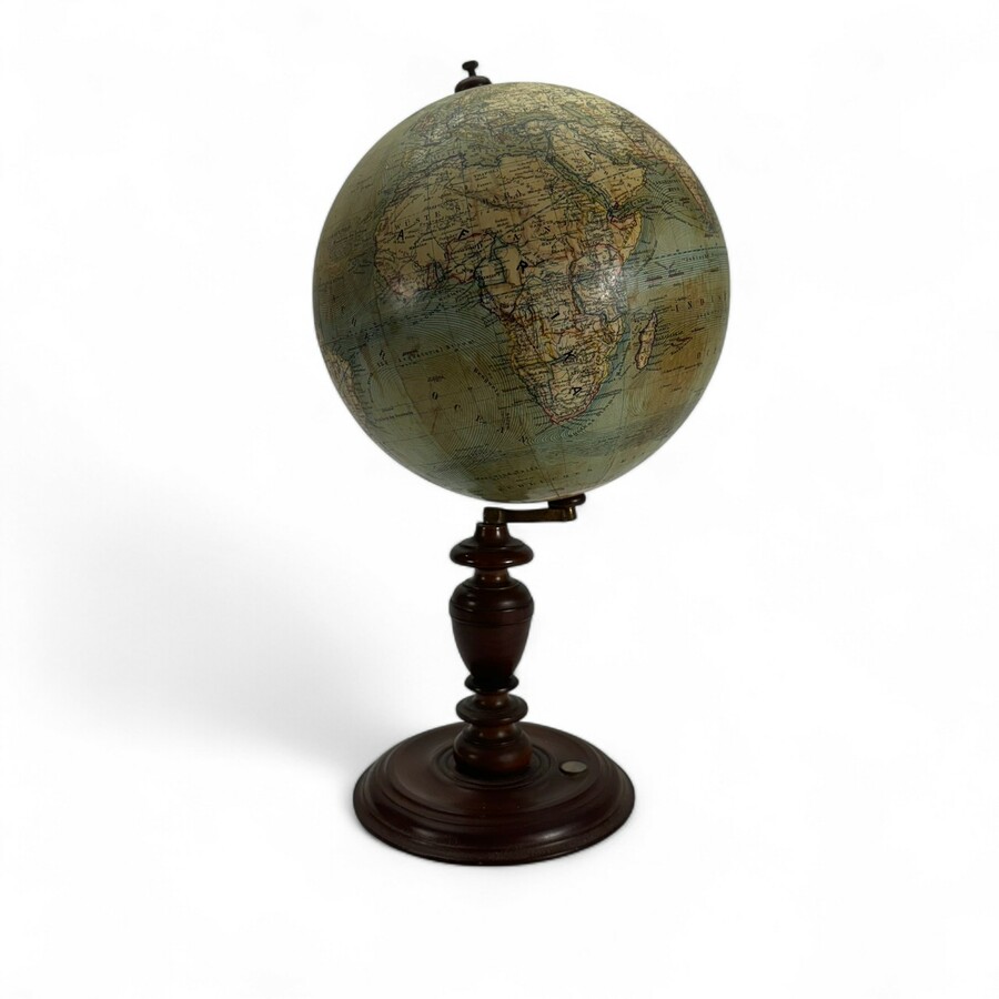 Een antieke wereldbol op gedraaide houten poot, met kompasje. Globe gemerkt 'Erd Globus 25 cm nach den neusten n. besten Quellen entworfen - Berlin - Ludw. Jul. Heymann'