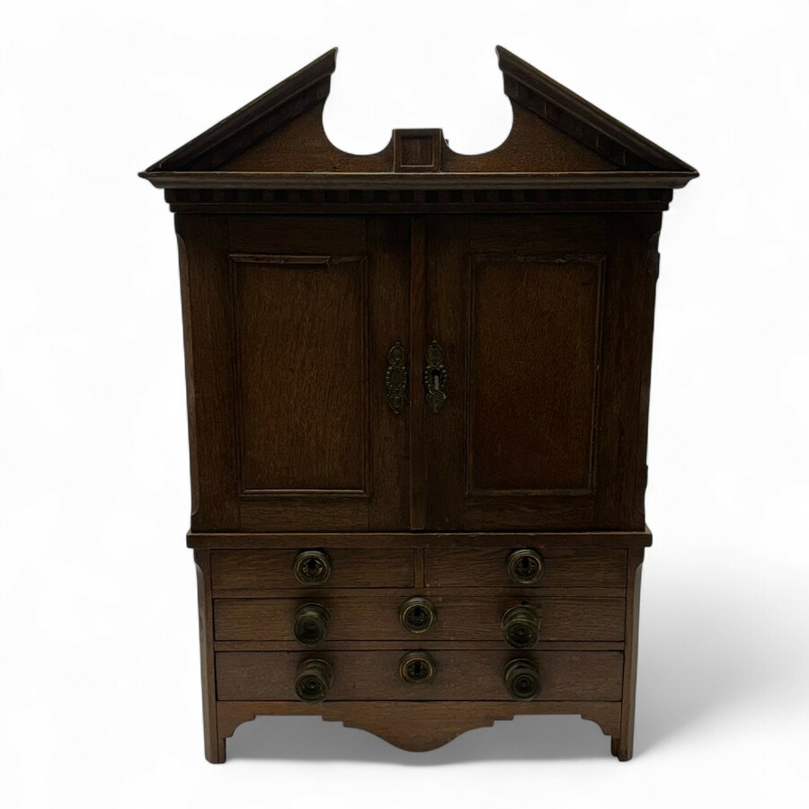 Een antiek 19e eeuws eikenhouten miniatuur kabinetje met timpaan en koperen beslag. Met vier lades en twee scharnierende deuren, met daarachter drie kleine lades.
