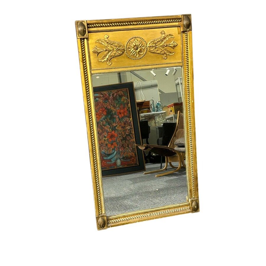 Een antieke vroeg 19e eeuwse Hollandse spiegel in gestoken houten en vergulde lijst. Empire periode, ca. 1810.