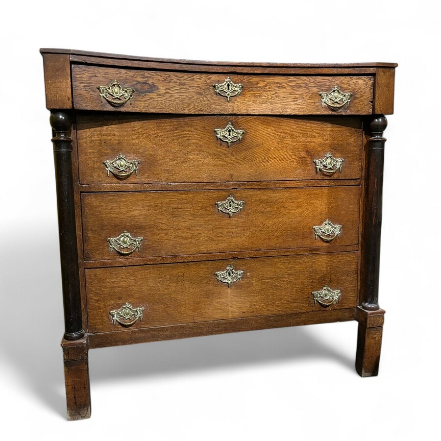 Een antieke eikenhouten ladekast of commode, met twee zwartgelakte pilaren, messing beslag en vier laden. Nederlands, eerste helft 19e eeuw.