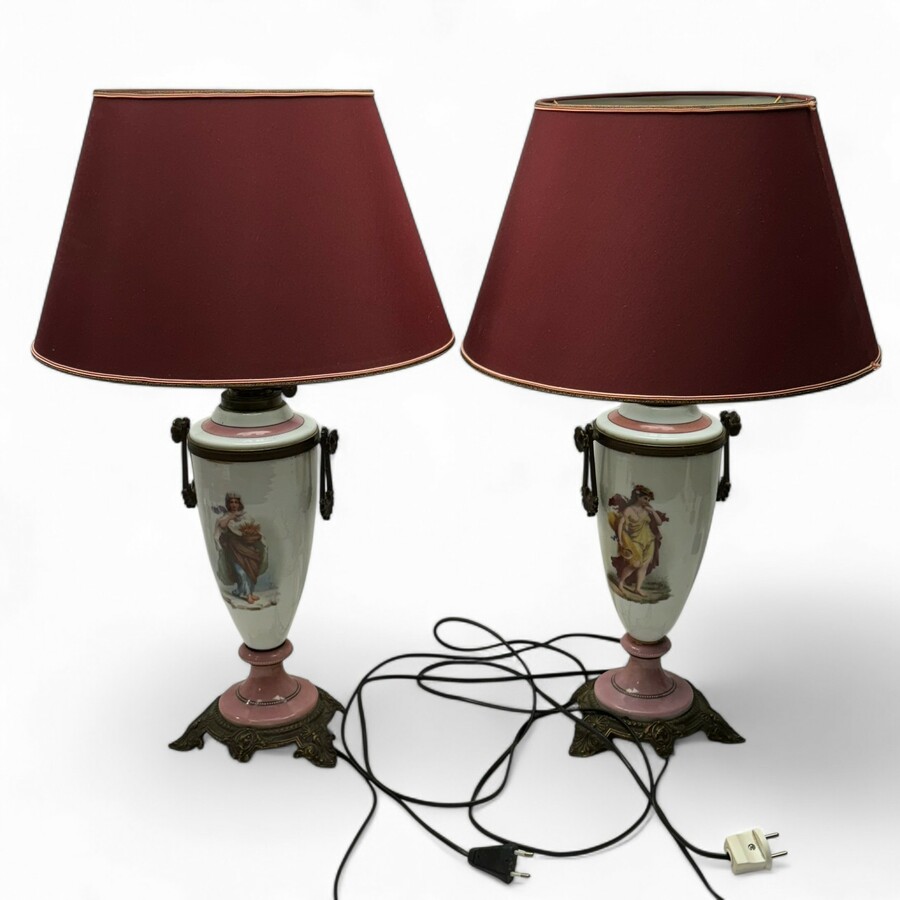 Lot van twee antieke 19e eeuwse opaline roze en witte olielampen, beschilderd met dames, met bronzen montuur. Omgebouwd naar elektrisch, met bordeauxrode kappen.