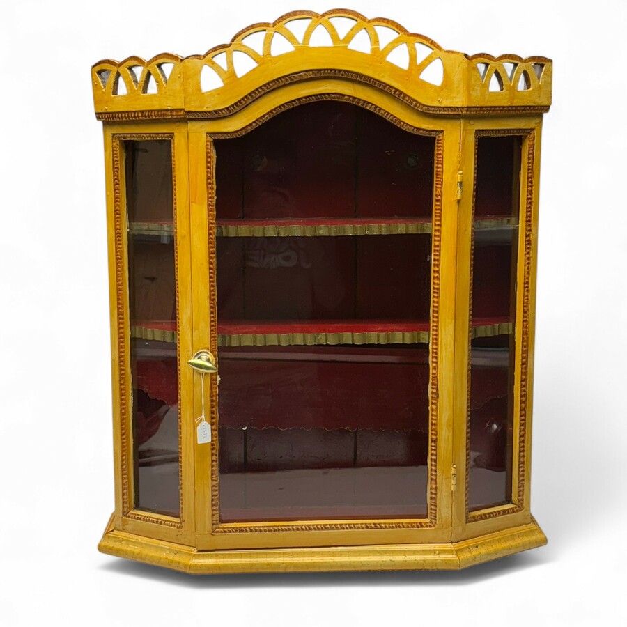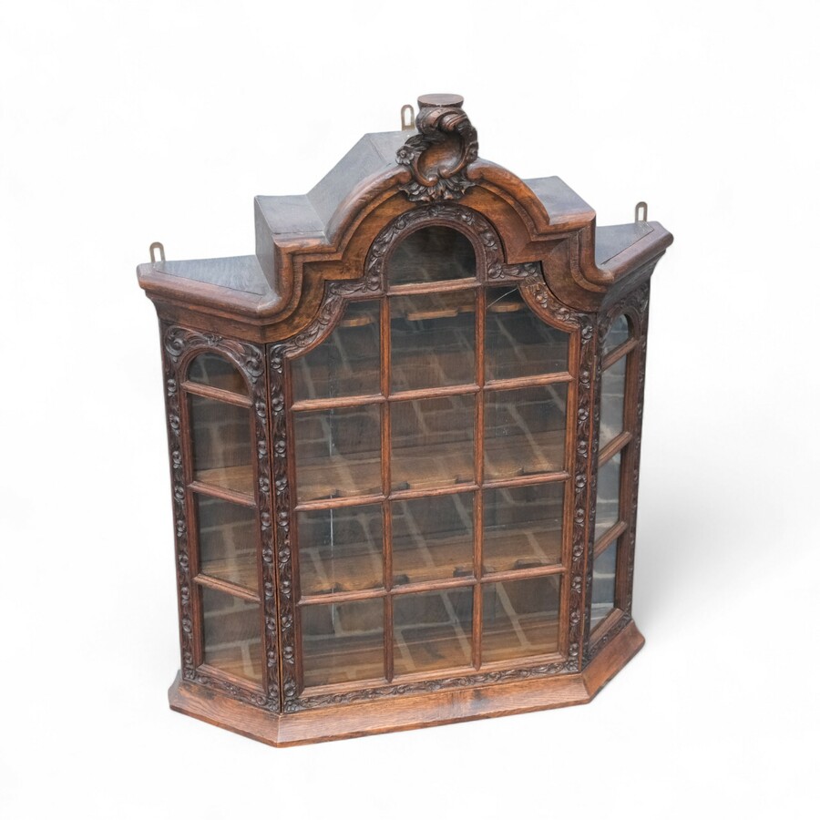 Een antiek 18e of 19e eeuws eikenhouten gestoken hangvitrinekastje