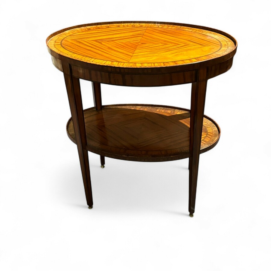 Een antiek 19e eeuws theetafeltje, Nederlands, Louis Seize stijl. Met vier taps toelopende poten, verbonden met plateau. Blad ingelegd met verschillende houtsoorten.