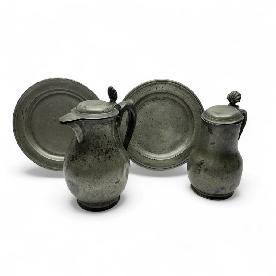 Lot divers antiek tin: een antieke schotel met initialen ‘PG’ & ‘IK’, gemerkt met roosje en ‘IVW’, en onduidelijk keur ‘..Egeningh’. De andere schotel gemerkt ‘Beens’ = vermoedelijk Wynant B...