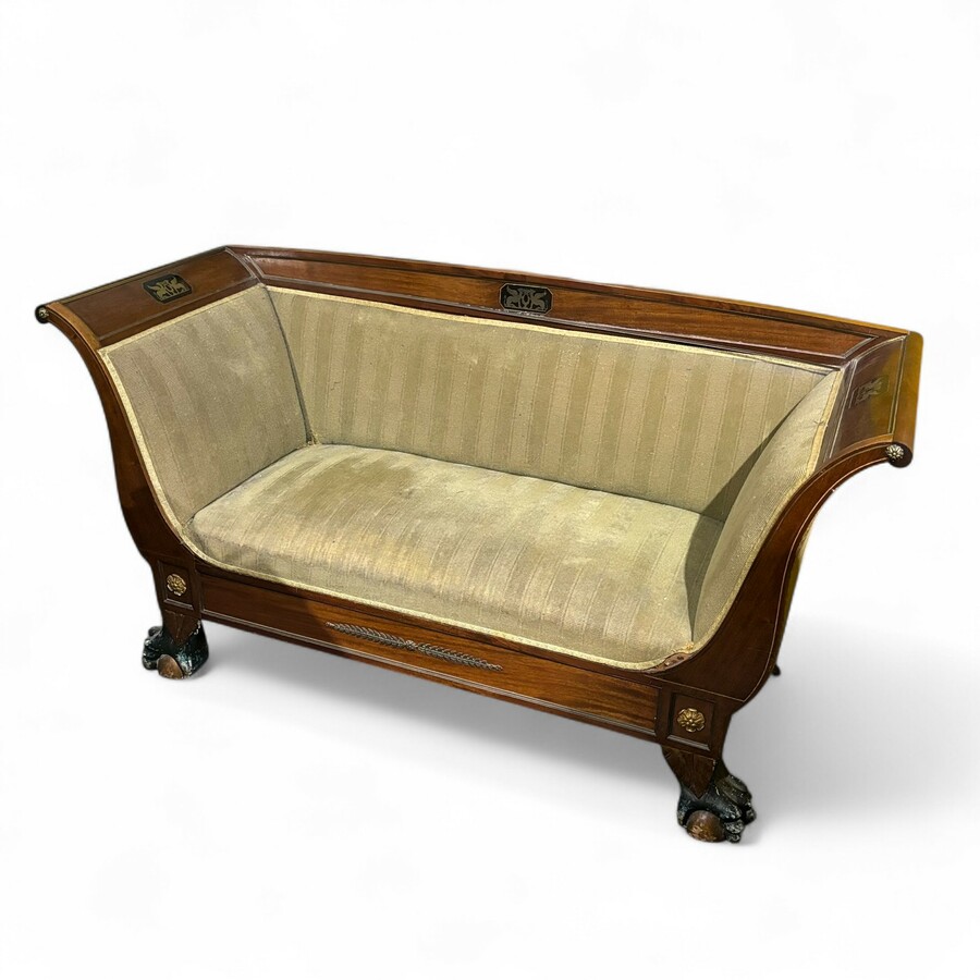 Een antieke 19e eeuwse mahoniehouten gefineerde bank, vroeg 19e eeuws. Met messing inleg en ornamentiek, op gestoken houten klauwenpoten, en drie medaillons van messing en ebben met voorstelling...